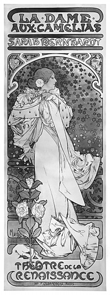 除了海报,穆夏还为伯恩哈特设计了戏剧节目单、布景、服装和珠宝等,作为画家的穆夏和作为戏剧演员的伯恩哈特是互相成就的。伯恩哈特极有天赋,被认为是“世界上最著名的女演员”以及圣女贞德之后最有名的法国女性。在19世纪70年代——“美好年代”的初期,伯恩哈特在法国就以舞台剧表演而出名,随后驰名欧美。她在一系列早期剧情电影中担任女演员并获得成功,人称“神选的莎拉”。在大众媒体文化迅速发展的时代,伯恩哈特的成功除了源于自身精湛的表演,还有赖于她较早懂得利用摄影和现代印刷技术来展现自我,提高在受众中的知名度。