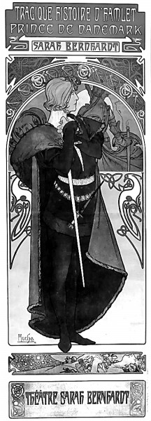 穆夏此后为伯恩哈特设计的戏剧海报都是她所出演的角色,《茶花女》《洛伦扎乔》《美狄亚》《托斯卡》和《哈姆雷特》无一例外。歌剧《茶花女》源于法国作家小仲马的同名小说,于1852年搬上歌剧舞台。伯恩哈特于1896年9月30日首次演出新版本《茶花女》,穆夏在海报中将女主角描绘成一个身着精致礼服的现代巴黎淑女。这幅海报不仅颠覆了《茶花女》昔日的古板形象,还对当时的时尚潮流产生了影响。法语版本的《哈姆雷特》于1899年5月首演,伯恩哈特扮演男主角哈姆雷特。穆夏设计的宣传海报中,由凯尔特风格图案装饰的拱形背景,映衬出哈姆雷特茕茕孑立的身影。特别精彩的是,镜像中有一个雄姿英发、英勇果断的背影,与主体犹疑不决的“延宕”王子形成了对比。