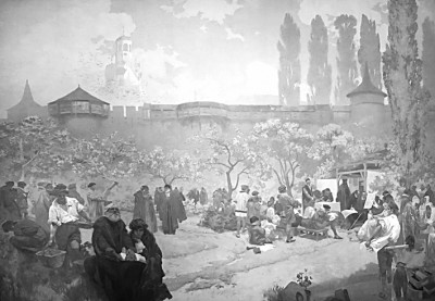 穆夏曾给朋友写信说:“……我看到自己的作品装饰着最上层社会的美术沙龙。我看着这些书籍,它们画满了各种传奇的场景、花卉和花环,刻画着女性的优美与柔情。我的时间,我最宝贵的时间,都消耗在这些作品上,而我的祖国就像一潭渐渐干涸的死水。在我的灵魂深处,我清楚地意识到自己正在罪恶地挥霍着本属于祖国人民的那些东西。”1910年春天,穆夏回到家乡布拉格,在1912年至1928年这十余年间创作了一系列大型历史画作——《斯拉夫史诗》,描绘包括捷克在内的斯拉夫民族从史前时代一直到19世纪的历史长河中最具纪念性的历史事件和场景。其中10幅是关于捷克人的历史,还有10幅描绘的是其他斯拉夫民族。