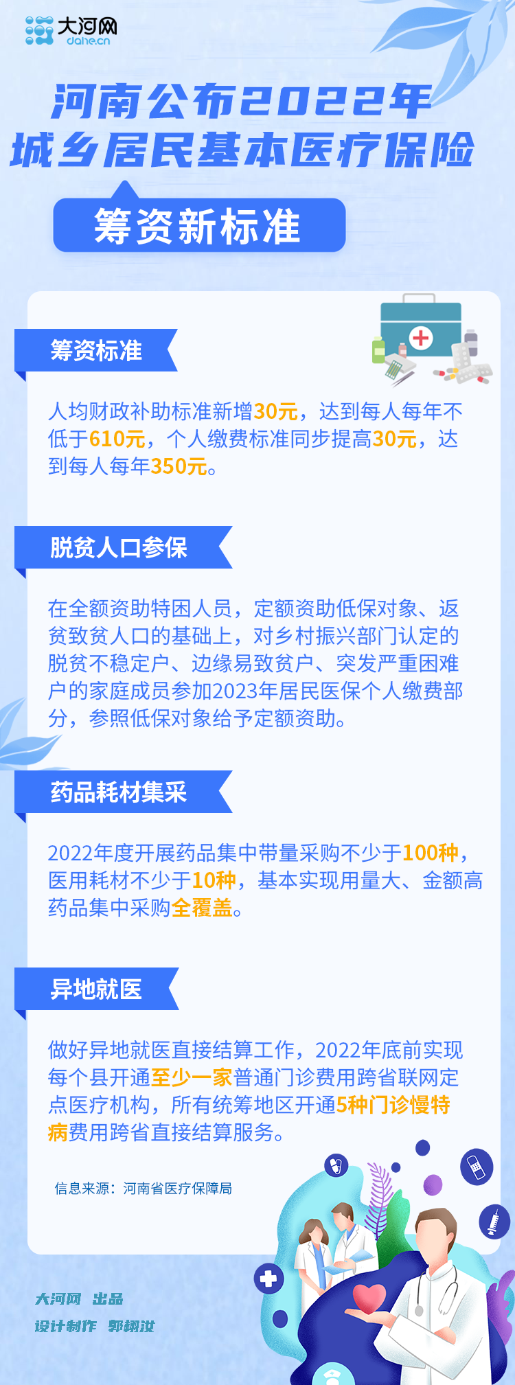 大河网讯 2022年,城乡居民基本医疗保险(以下简称“居民医保”)人均财政补助标准新增30元,达到每人每年不低于610元,同步提高个人缴费标准30元,达到每人每年350元。9月14日,省医保局会同省财政厅、省税务局印发《关于做好2022年城乡居民基本医疗保障工作的通知》(以下简称《通知》),确定2022年城乡居民基本医保筹资标准。
