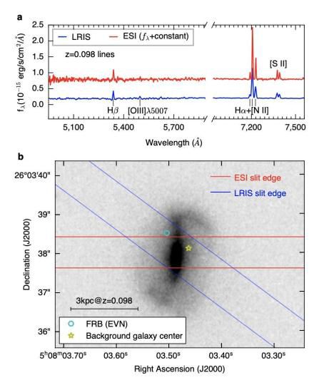 FAST快速射电暴优先和重大项目科研团队还通过国际合作,使用美国10米凯克光学望远镜(Keck)对FRB 20201124A的宿主星系进行深度观测,发现其宿主星系是约银河系尺度大小、富金属的棒旋星系,并且发现它所在区域恒星密度较低,处于旋臂之间,距离星系中心中等距离,表明该快速射电暴并非起源于大质量恒星极端爆炸导致的超亮超新星或伽马射线暴后形成的年轻磁星。