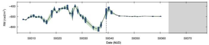科研团队表示,这些现象都说明,在FRB 20201124A这个快速射电暴周围1个天文单位的环境是非常复杂并且在动态演化着。通过偏振振荡现象,他们对该快速射电暴周围1个天文单位的环境的磁场给出直接限制,达到高斯量级以上。