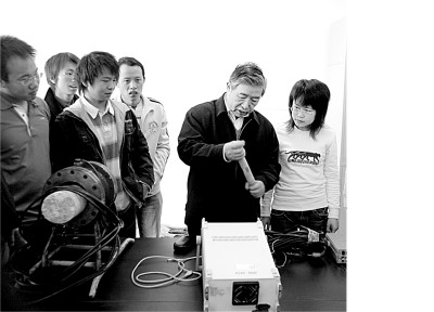 姜涛院士(右一)在实验室指导学生开展造球实验。资料图片