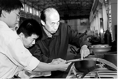 王国栋院士(右)指导学生进行轧制试验。资料图片