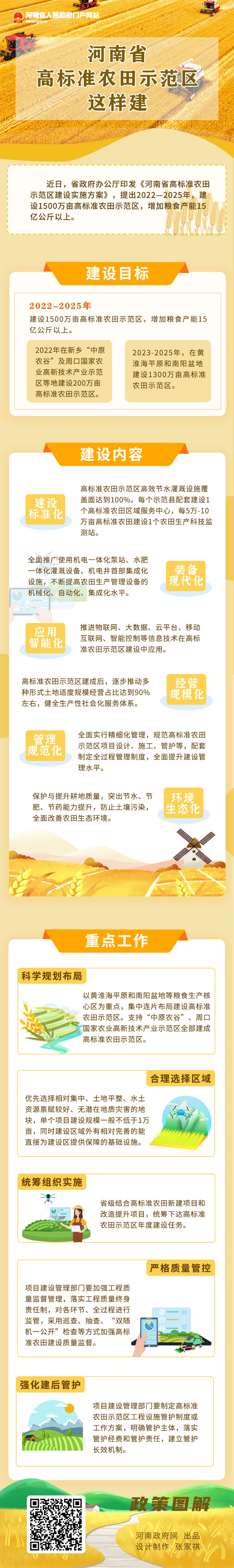 《实施方案》提出,2022-2025年,建设1500万亩高标准农田示范区,增加粮食产能15亿公斤以上。其中,2022年在新乡“中原农谷”及周口国家农业高新技术产业示范区等地建设200万亩高标准农田示范区;2023-2025年,在黄淮海平原和南阳盆地建设1300万亩高标准农田示范区。同时要求全省高标准农田示范区的亩均总投资规定一般不低于4000元。