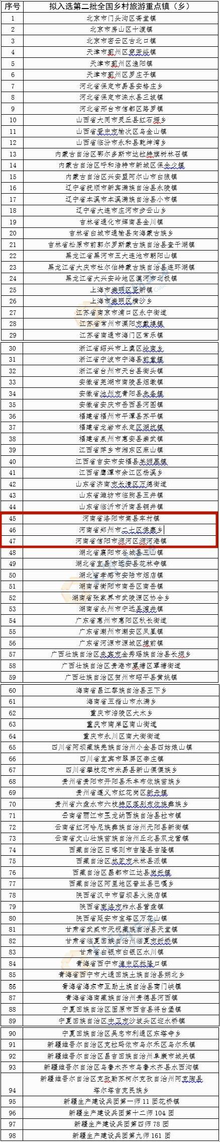 共有98个乡镇拟入选第二批全国乡村旅游重点镇(乡)。其中,河南省有3个乡镇拟入选,分别是洛阳市嵩县车村镇、郑州市二七区侯寨乡、信阳市浉河区浉河港镇。