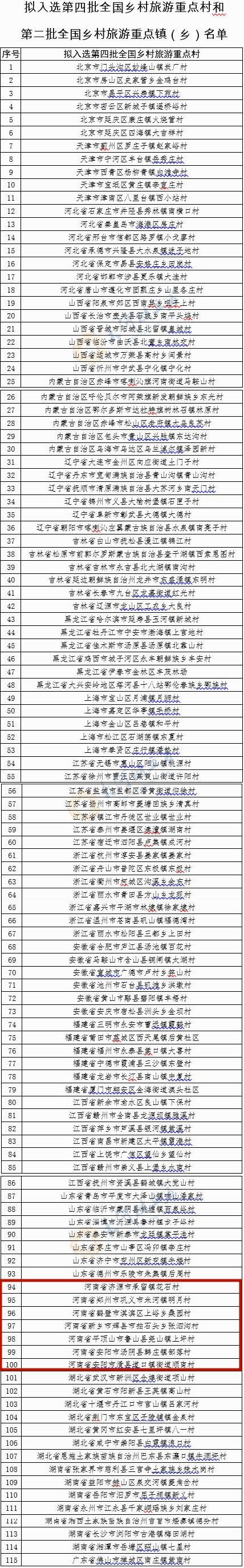 名单显示,共有200个村拟入选第四批全国乡村旅游重点村。其中,河南省有7个村拟入选,分别是济源市承留镇花石村、郑州市巩义市米河镇明月村、鹤壁市淇滨区上峪乡桑园村、新乡市辉县市拍石头乡张泗沟村、平顶山市鲁山县尧山镇上坪村、安阳市汤阴县韩庄镇部落村、安阳市滑县道口镇街道顺南村。
