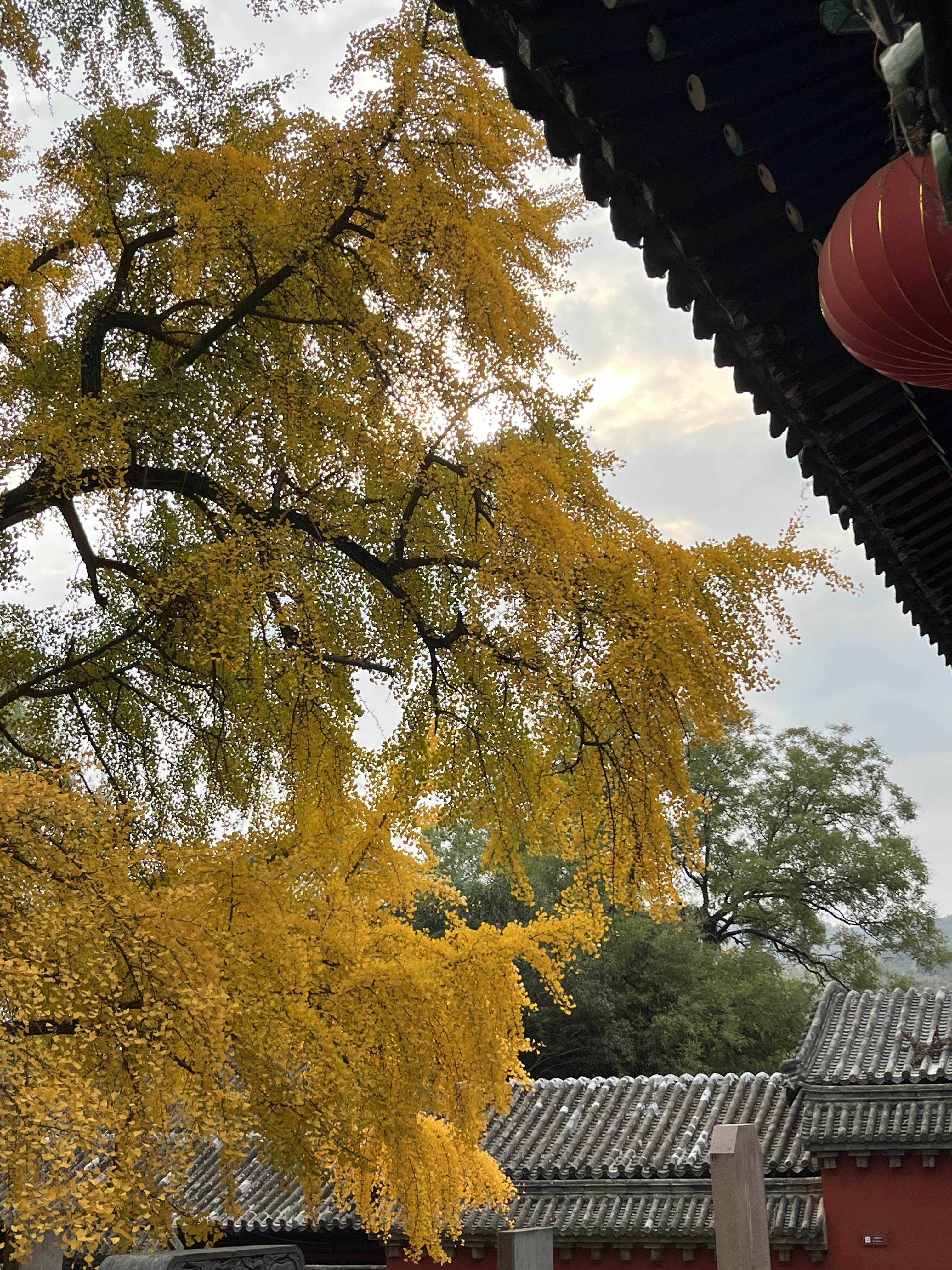 逢寺必栽银杏树,银杏树树干高大、叶素雅洁净,秋冬之际金色的银杏叶铺满寺院,衬托出寺院的庄重肃穆。金黄落叶与僧衣融为一体,创造出超脱尘世的空灵。银杏树作为佛门圣树,有着植物界“活化石”的美誉,生长慢、寿命长的特质使银杏树本身就自带光环,充满灵性。