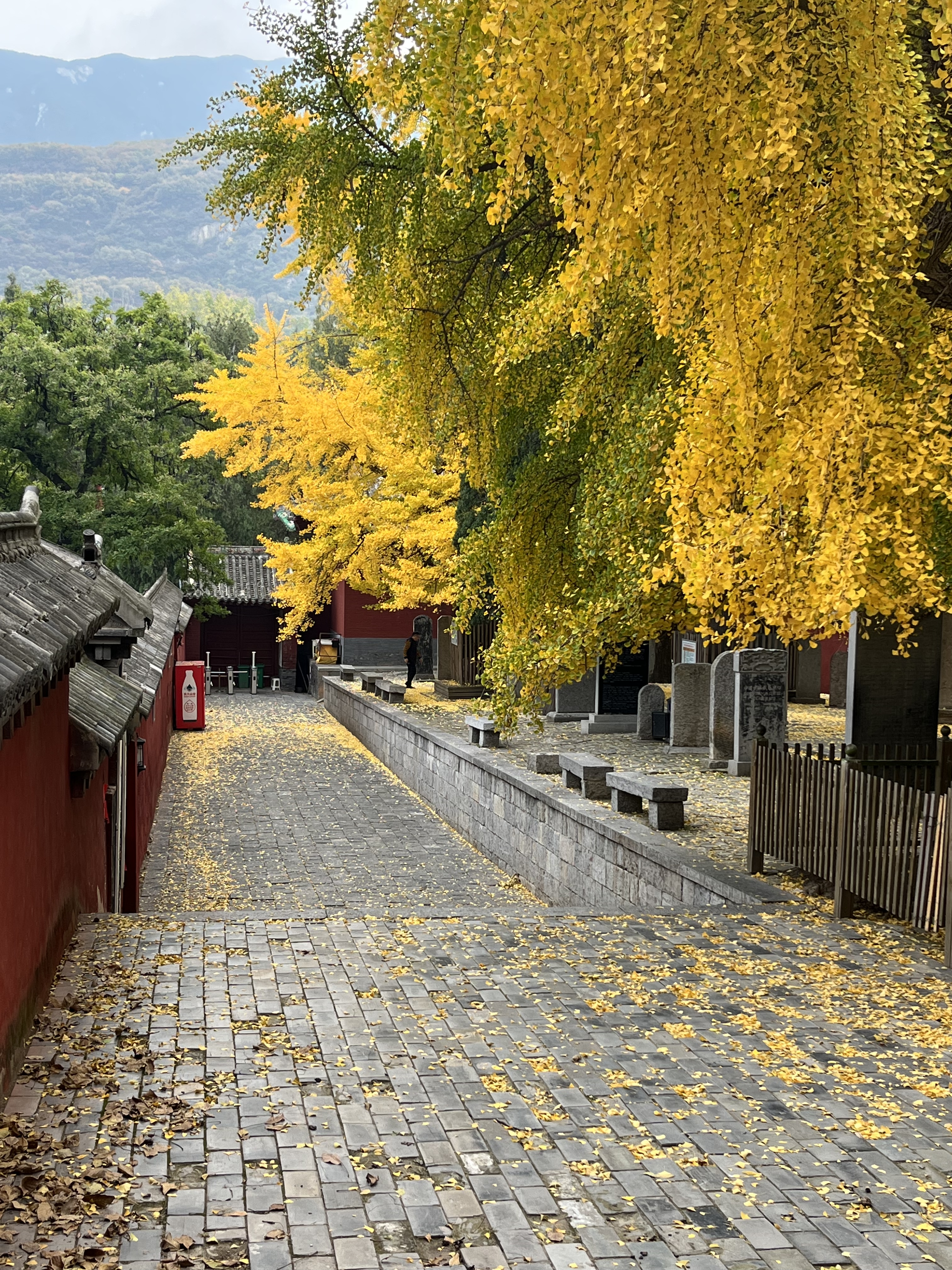 银杏树是目前世界上最古老的树种之一,它不但有很高的药用价值,也有较高的观赏价值。随风飞舞的扇形银杏叶如金色蝴蝶,零落飘散在甬道和莲阶之上,与僧人、古朴的寺庙建筑相得益彰,令禅宗祖庭少林寺禅意愈浓。(图片提供:邹相)