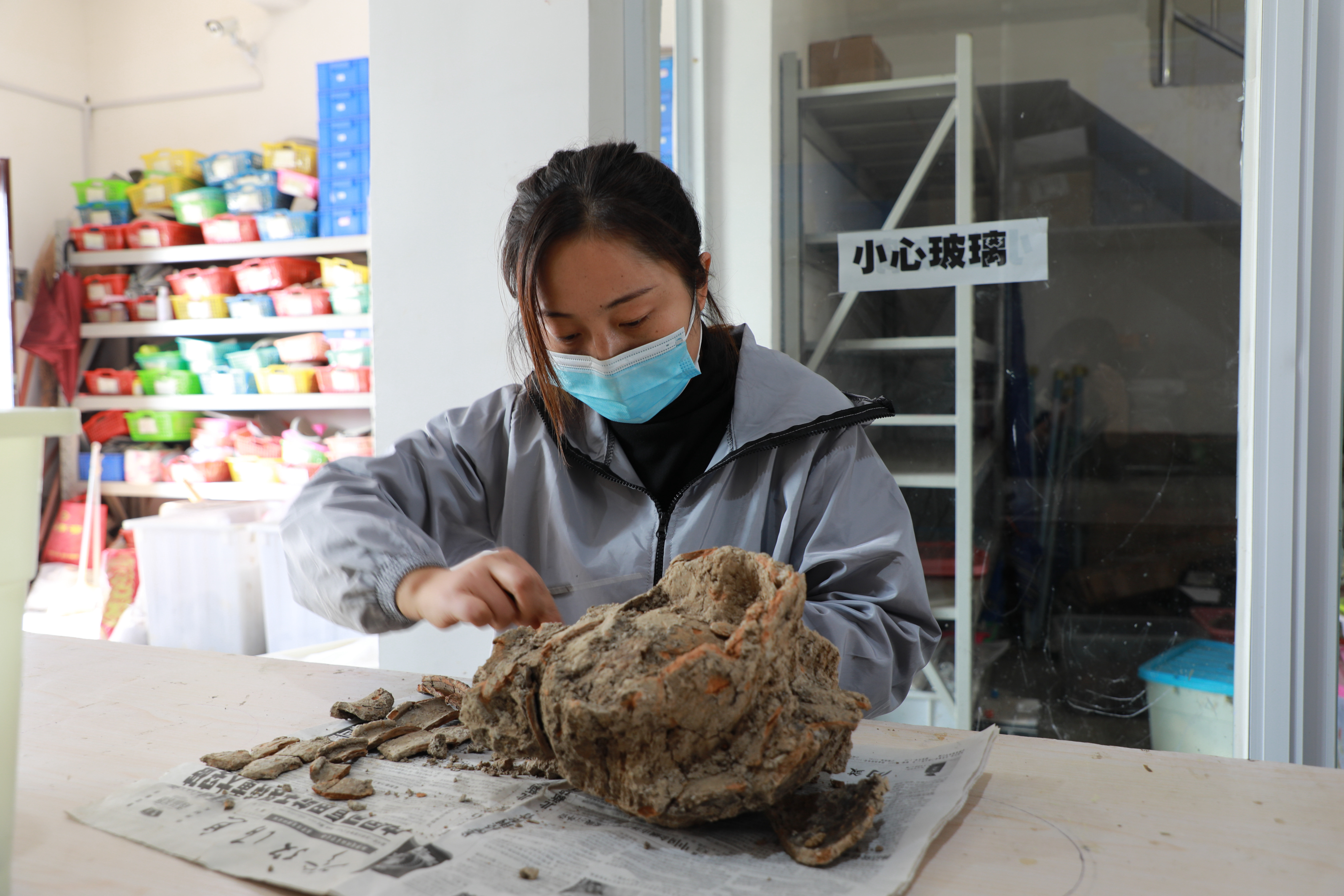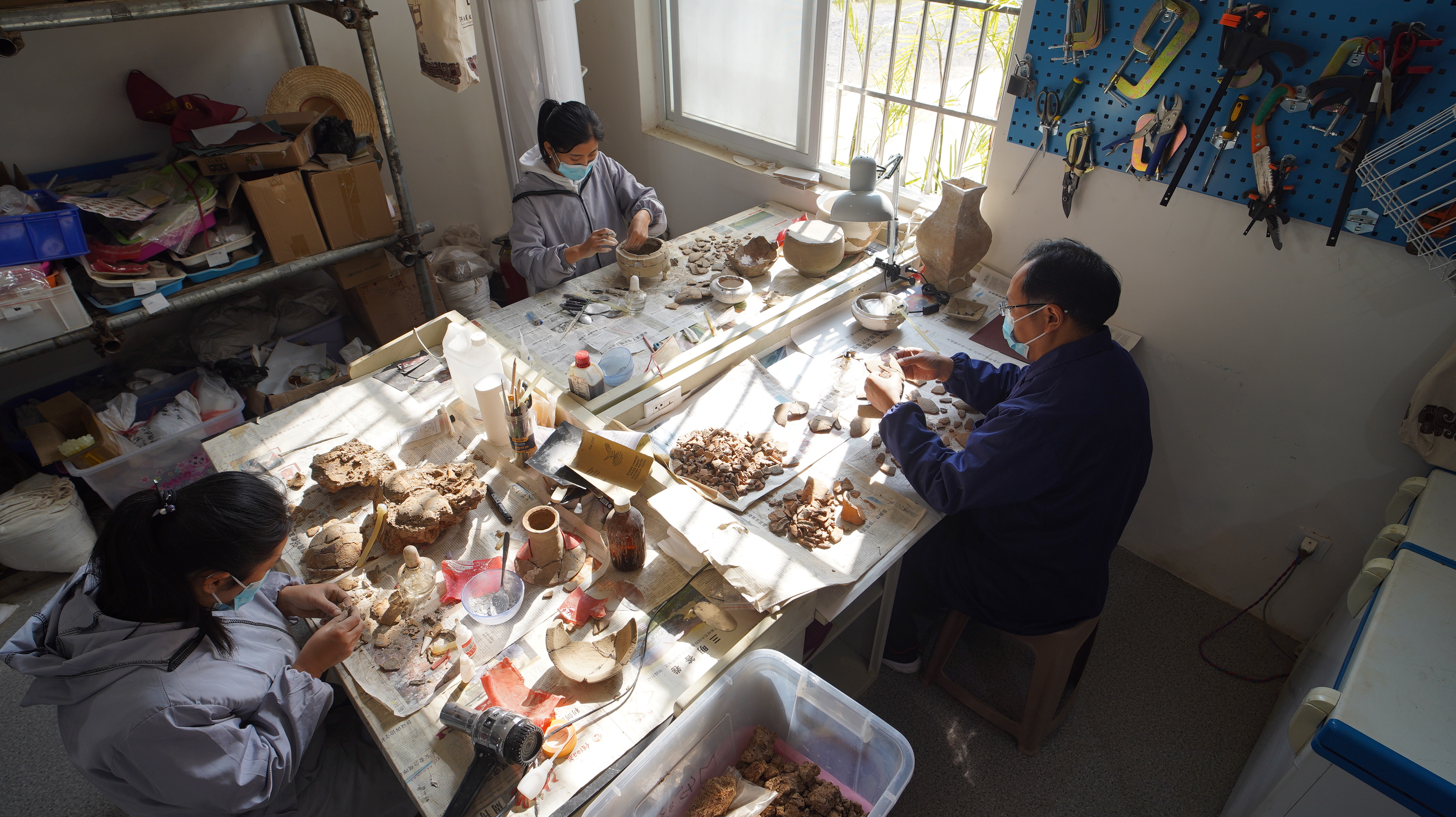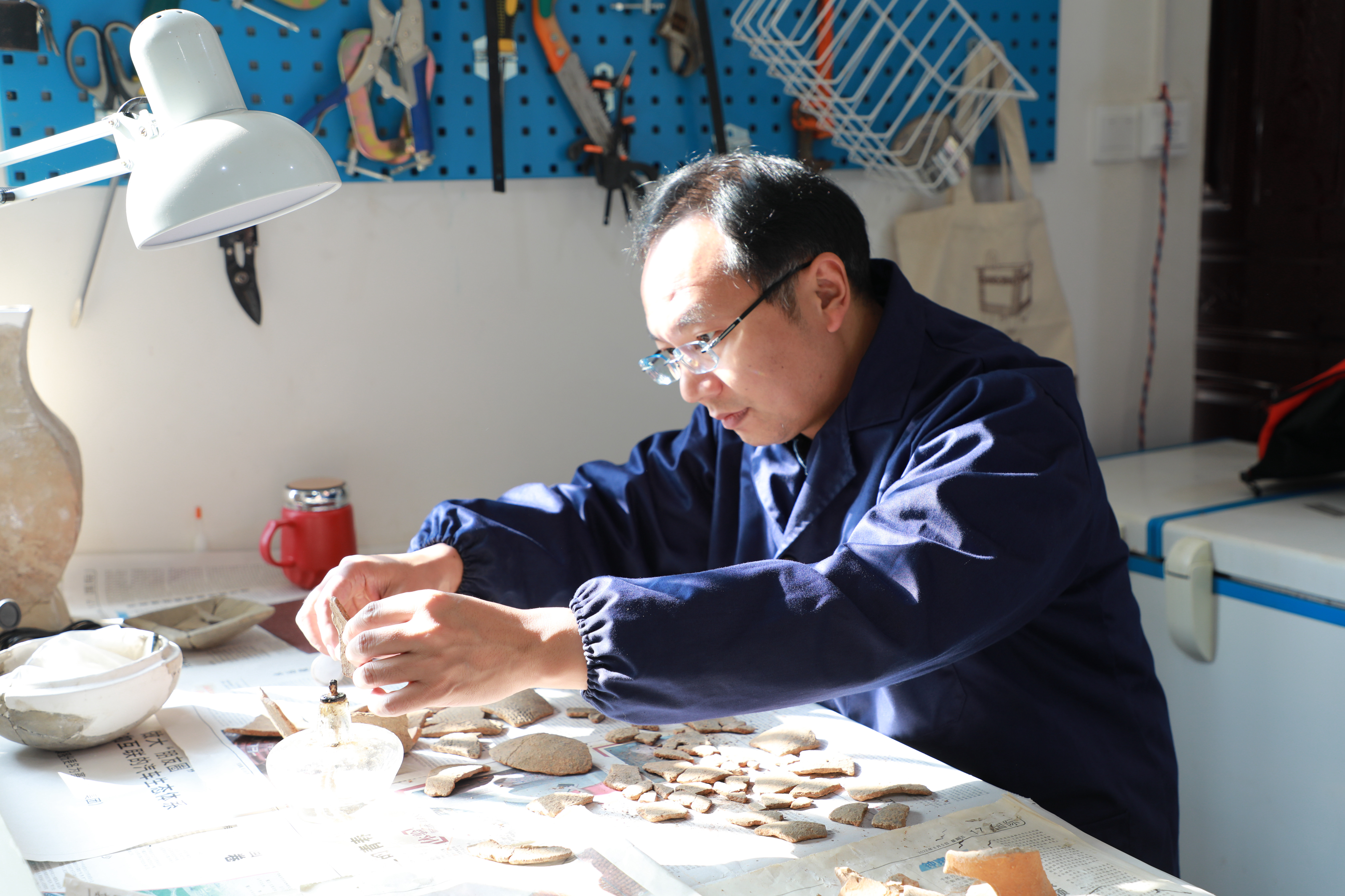 大河网讯 11月7日,从信阳市平桥区城阳城址保护区出发,穿过几个村落,便来到了河南省文物考古研究院信阳工作站。一间20平方米左右的房间内,几位文物修复师在自己的一方天地里忙活着。三张桌子、两个陈列架,就是这个工作站的全部“家当”。