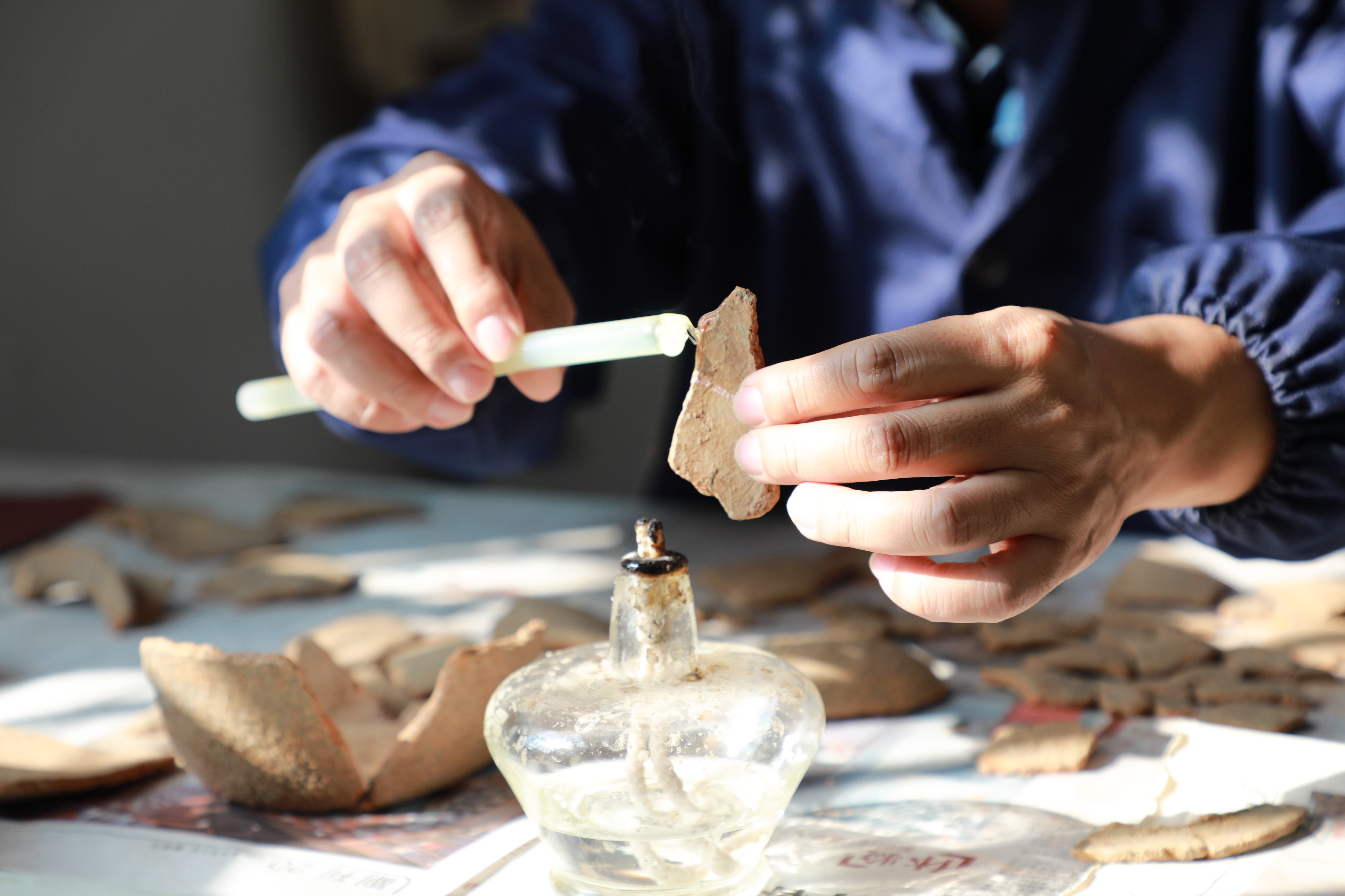 坐在房间最里面的修复师贺兵一直默不作声,她正忙着用物理胶进行粘补工作,性格内敛的她,不善言辞,但她却能通过双手触摸文物,与千年前的古人进行对话。“修复师听上去‘高大上’,其实我们的工作很简单枯燥,有时候一坐就是一天。”