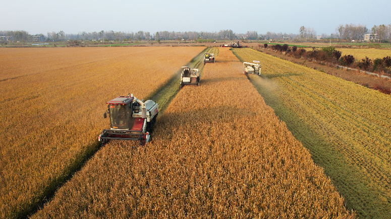 大河网讯 11月10日,在淮滨县三空桥乡的金色稻田上,发出阵阵轰鸣声的收割机正在紧张收割水稻,种粮大户胡宝山今年种植的3000多亩糯稻进入成熟收获期,田间地头一派“镰到丰收满野忙”的好“丰”景。