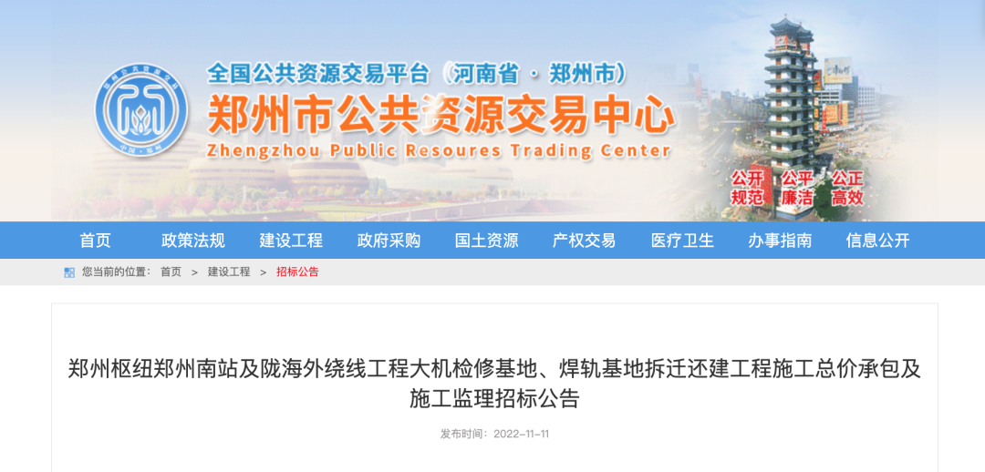 继9月27日郑州市生态环境局公布改建铁路郑州枢纽陇海外绕线及郑州南站工程建设项目环境影响报告书后,11月11日,郑州市公共资源交易中心发布了《郑州枢纽郑州南站及陇海外绕线工程大机检修基地、焊轨基地拆迁还建工程施工总价承包及施工监理招标公告》。