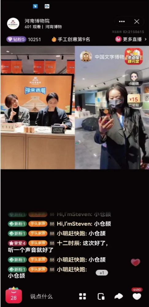 连麦开始后,来自中国文字博物馆的帆帆和老杨首先向大家介绍了“小仓颉”IP 形象及其文创衍生品,随后带领大家云逛了“河南文博文创”特展,奇趣、多样的文创产品令直播间的粉丝纷纷直呼“小孩子才做选择,成年人当然要all in!”当天直播间内粉丝热情高涨,现场抽奖不停、活动不断。 融洽的互动氛围也为今后省内博物馆的强强联动提供了一个很好的范例。