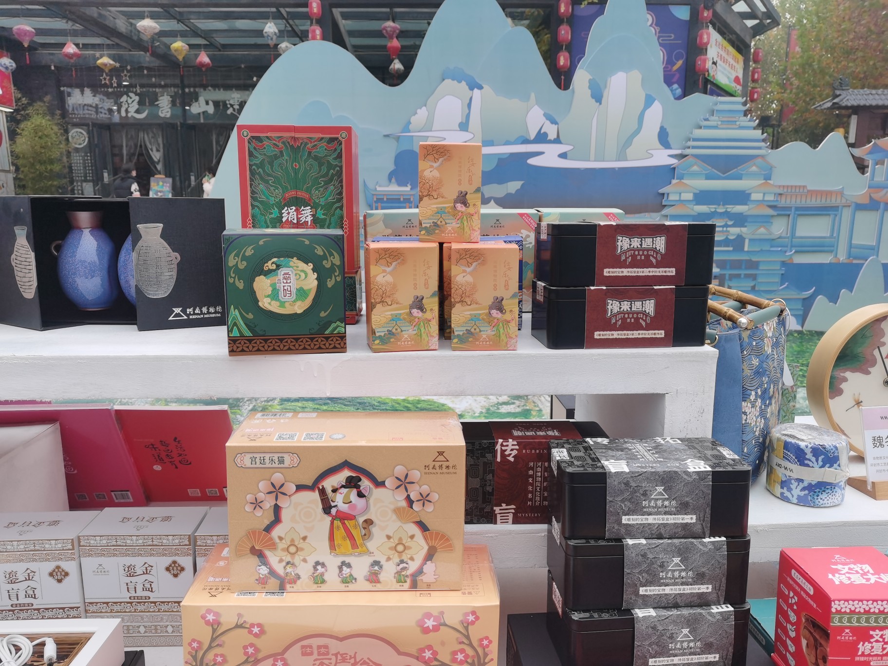 与此同时,黄河之礼@诗画鹤壁旅游商品嘉年华活动也于11月19日在鹤壁市朝歌里广场举办,河南博物院受邀参与其中。省内众多代表性文创品牌“黄河之礼”“豫博文创”“豫游纪”“唐宫夜宴”“华冠文化”“爱奇葩”“爱玩美手工”等将集中展出。同时现场还展示了包括鹤壁窑、根雕、汴京宋室风筝在内的十余种非遗项目作品、研学教具。除此之外,精彩的诗经灯谜、网红飞盘、非遗演艺、汉服走秀等也让在场的观众大饱眼福。整场活动打造了沉浸式黄河文化潮玩体验场景,为游客带来一场古今交融的全新体验。