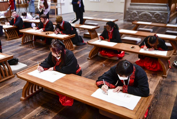 在充满浓厚儒家文化氛围的大学堂仁厅内,大家手执毛笔,凝神静息,读写《论语》,体会孔子思想中的智慧。