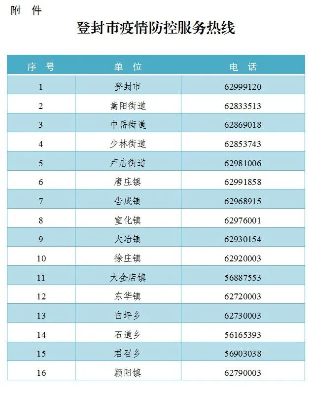 附件:登封市疫情防控服务热线