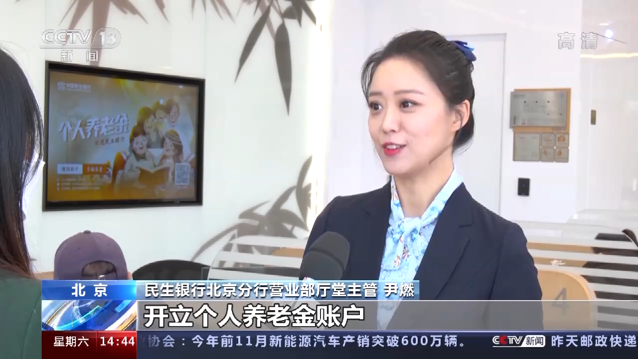 民生银行北京分行营业部厅堂主管 尹燃:开立个人养老金账户可以参与微信立减金的抽奖活动,金额大概在8块8到388元不等,我们也是希望用这样有趣的方式,鼓励广大的客户更多地参与到个人养老金的政策福利里来。