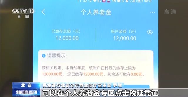 民生银行北京分行营业部厅堂主管 尹燃:缴费的当天是看不到缴费凭证的,在缴存资金以后,就是次月5日之后,可以在个人养老金专区点击税延凭证,查看并下载个人养老金缴费凭证就可以了。