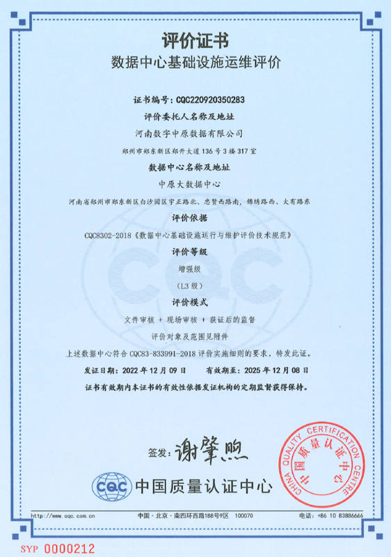 【大河财立方消息】12月12日,据豫信电子科技集团,12月9日,中原大数据中心正式通过中国质量认证中心专家评审,获得CQC8302-2018数据中心基础设施运维评价证书(L3增强级),成为全省首家获此证书的数据中心。