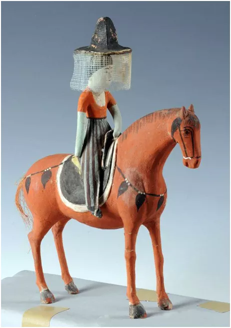 吐鲁番阿斯塔那唐墓出土的彩绘陶俑中有戴帷帽的妇女形象,其中一尊骑马女俑的帷帽用泥制,外表涂黑,以方孔纱作帷,帷裙垂至颈部。帷帽帽体用皮革、毛毡或竹藤编织,外覆黑色纱罗等物,能防风沙。