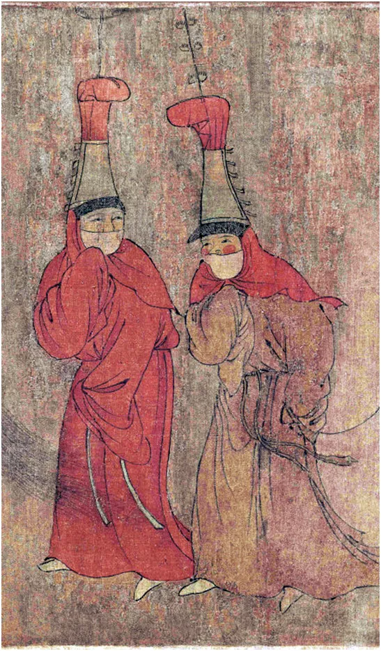 1990年,唐太宗的妃子燕氏的墓室被清理出来,墓室壁画中,宫女手中所捧的帷帽垂挂着一圈长丝穗,形成一道薄幕,有一定卫生防护功能。