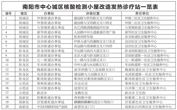 为应对出现的发热高峰,贯彻落实好市委主要领导批示精神,现将南阳市中心城区首批20个核酸检测小屋改造成发热诊疗站(名单见附件),于2022年12月26日起开始接诊服务,缓解医院发热门诊患者激增,居民小区附近买药困难的问题。