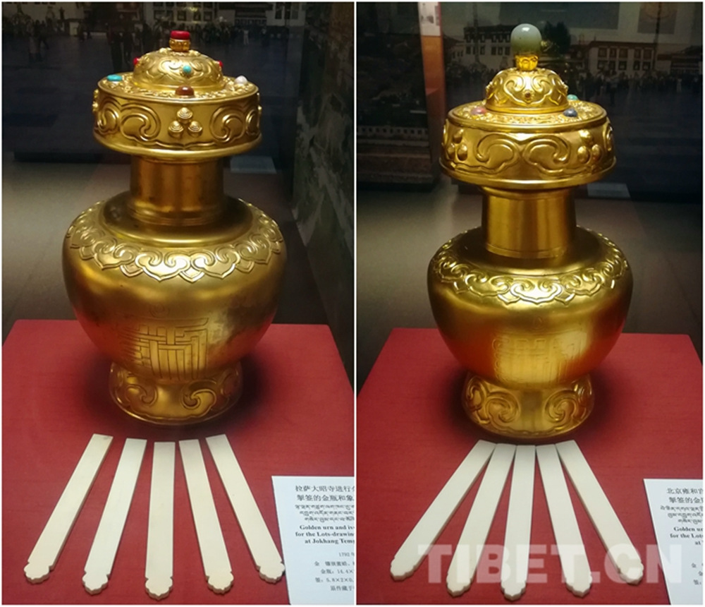图左为大昭寺进行金瓶掣签的金瓶和象牙签(复制品),图右为雍和宫进行金瓶掣签的金瓶和象牙签(复制品)摄影:李元梅