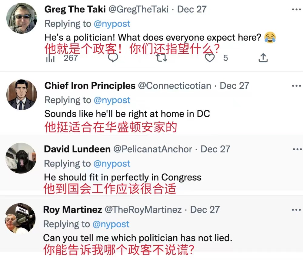 桑托斯造假丑闻曝光后,有网友讽刺说,桑托斯这种人品到美国国会工作应该“很合适”,甚至算得上“当总统的料”。还有网友一针见血地指出美国政坛乱象——哪个政客不说谎?