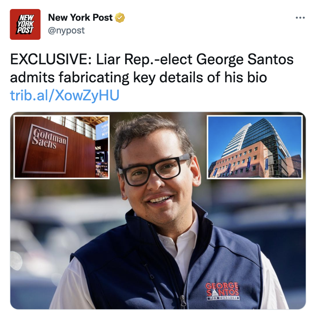 为了博取各方选民支持,桑托斯竞选期间想方设法凸显身份多元化,给自己打上一系列“引流标签”,还宣称个人经历“充分体现美国梦”,诸如曾在纽约市立大学巴鲁克学院读本科并取得经济学和金融学学位、曾供职华尔街金融巨头花旗集团和高盛集团、家族拥有十几处产业等。