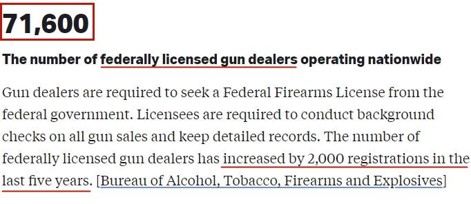 正是由于该法的保护,全美范围内获得联邦许可证的枪支经销商在过去五年中又增加了2000家,总数达到7.16万家。