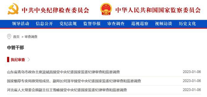 6日下午,中央纪委国家监委网站接连发布三条官员被查信息,分别是山东省青岛市政协主席汲斌昌,国家烟草专卖局原党组成员、副局长何泽华,以及河北省人大常委会原副主任王雪峰。
