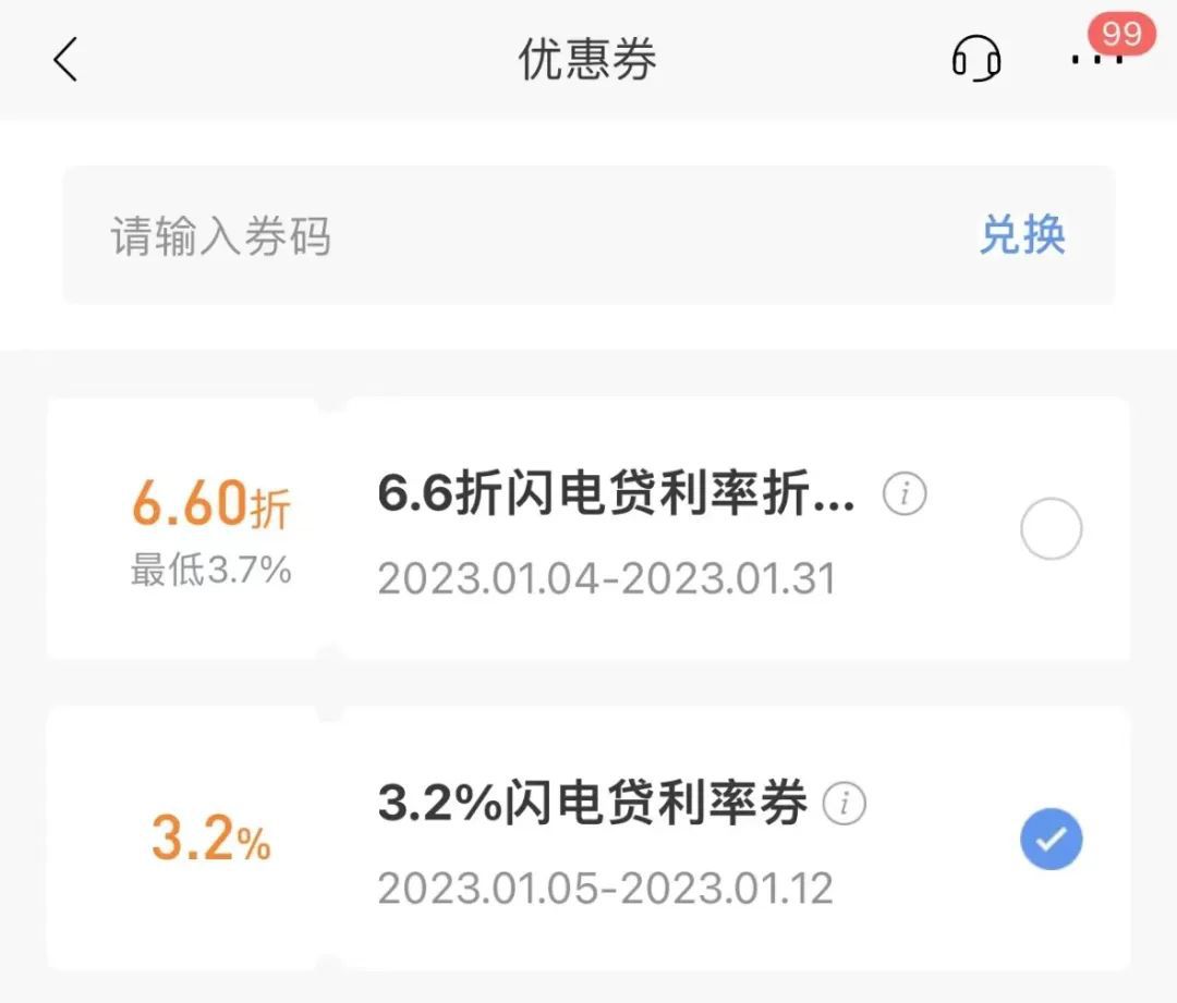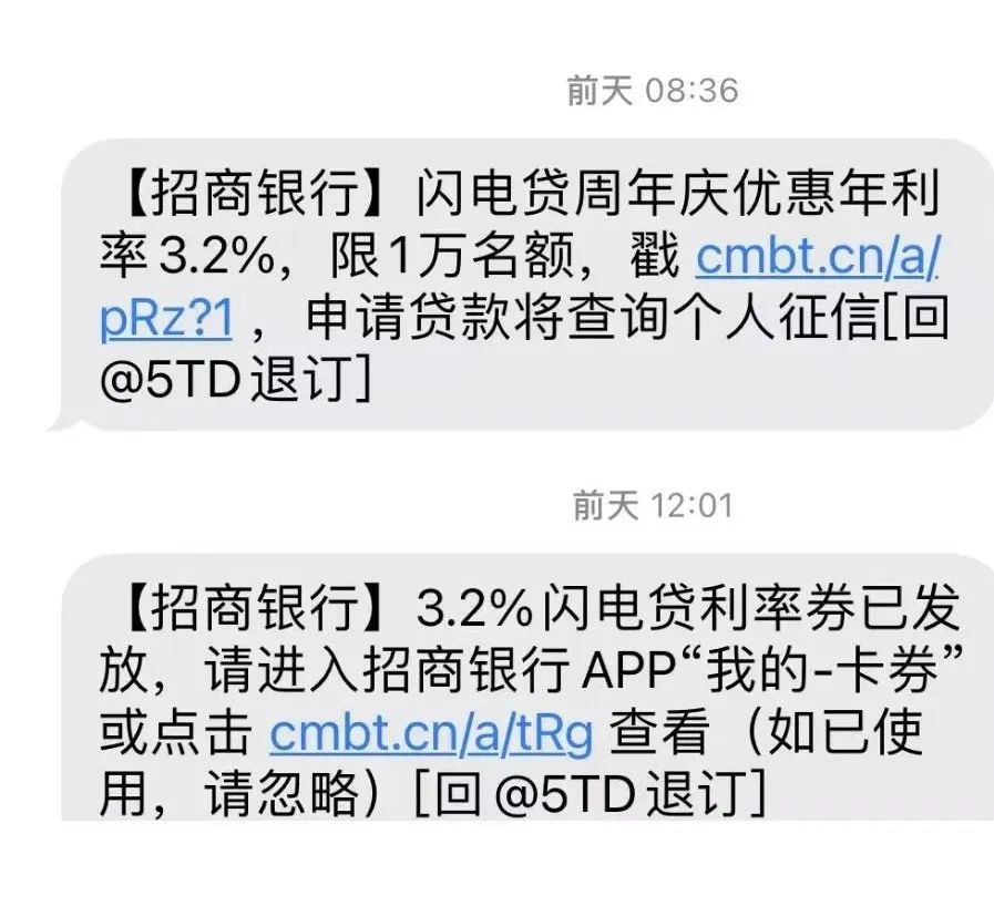 “3.2%闪电贷利率券已发放,请进入招商银行APP中查看。”