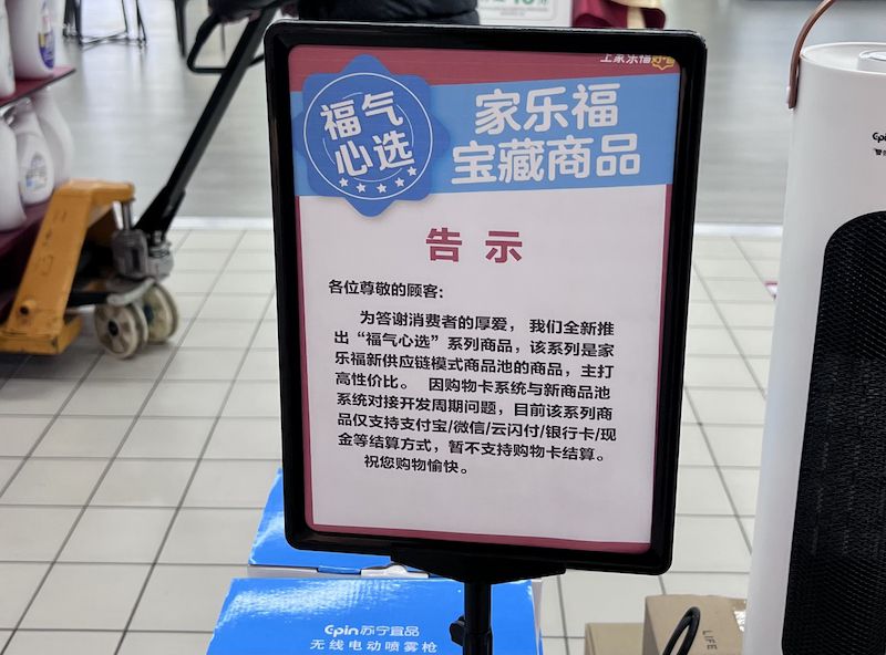 该指示牌同时也解释了家乐福超市被曝购物卡消费受限的情况,根据指示牌显示:“因购物卡系统与新商品池系统对接开发周期问题,目前该系列商品(“福气心选”商品)暂不支持购物卡结算。”