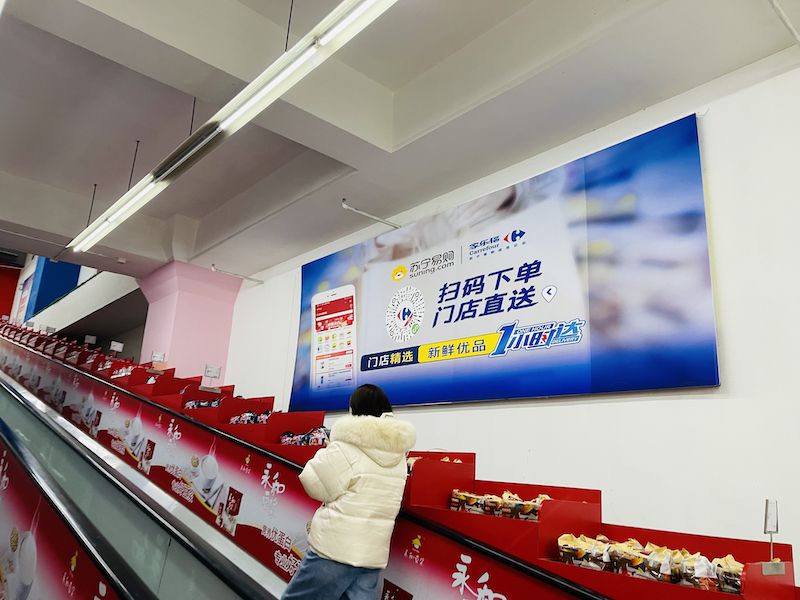 在部分家乐福门店,第一财经记者的确看到其通过海报等方式强调在线下单,门店直送的线上线下融合方式。