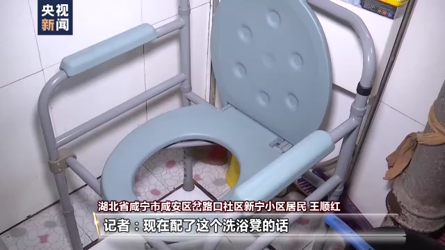 湖北省咸宁市咸安区岔路口社区新宁小区居民 王顺红:原来就用盆,给他擦洗。现在方便多了,洗浴凳又稳,不怕摔跤,带来很大的方便。