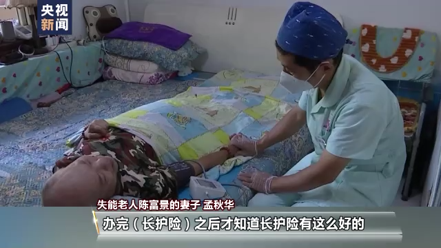 失能老人陈富景的妻子 孟秋华:护理员一来就帮他揉,我就轻松多了,白天来的好几个小时我能休息,办完长护险后才知道长护险这么好,又解决家庭经济困难,还有人帮着照顾,我说老头子有救了。