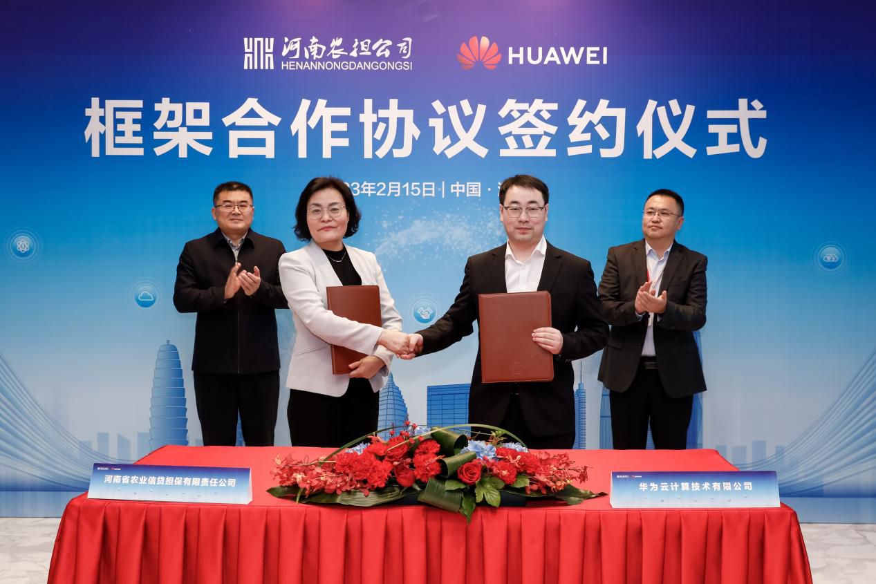 【大河财立方 记者 李震 陈玉尧】2月15日下午,河南省农业信贷担保有限责任公司(简称河南农担公司)与华为云计算技术有限公司(简称华为云)签署全面合作框架协议,双方将在生态合作、数字化转型、数字人才队伍建设等方面深入合作,全力打造全方位一站式智慧化金融服务,为金融助农插上数智化“翅膀”。