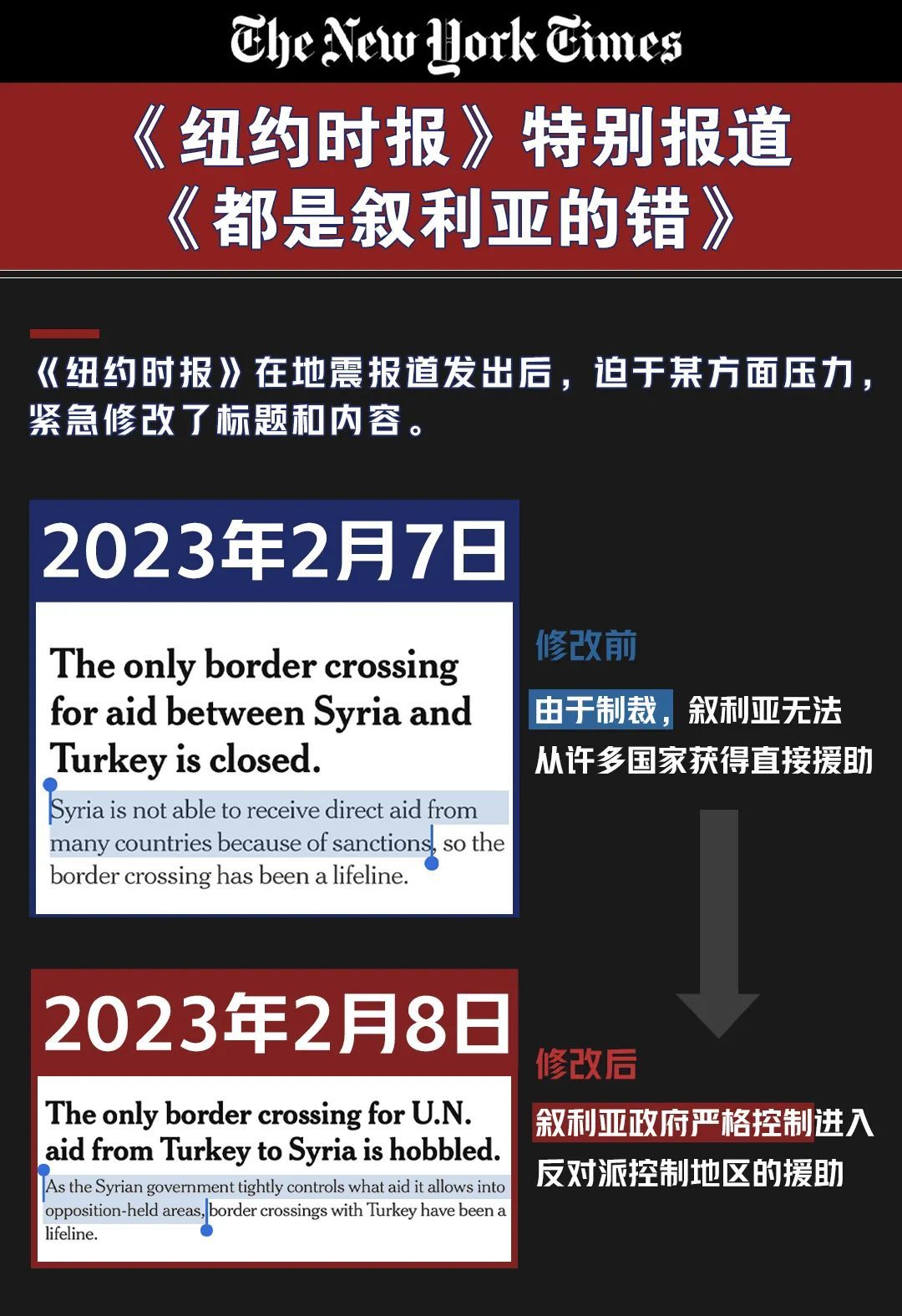 2023年2月,《纽约时报》在报道叙利亚地震时,修改了标题和内容,将叙利亚无法得到援助的原因归咎于叙政府。(图源 | 玉渊谭天)