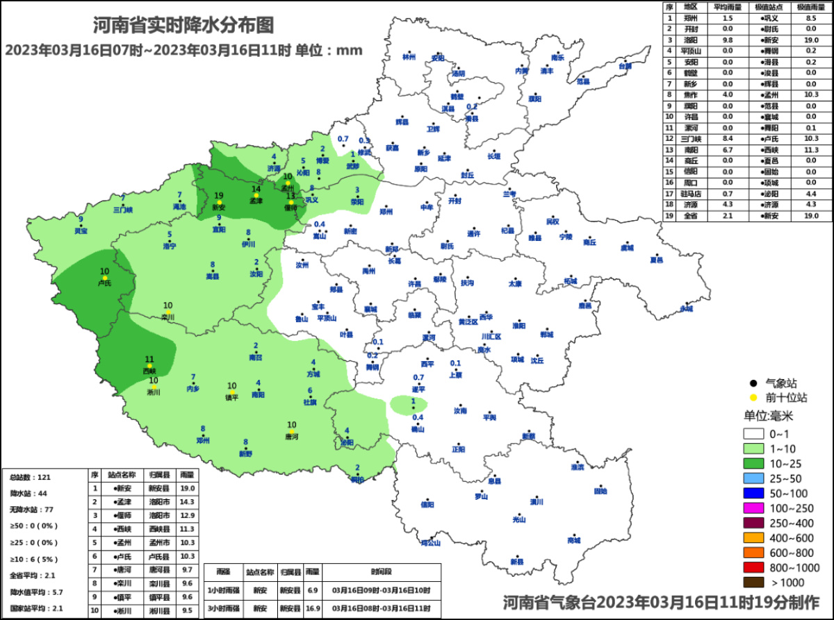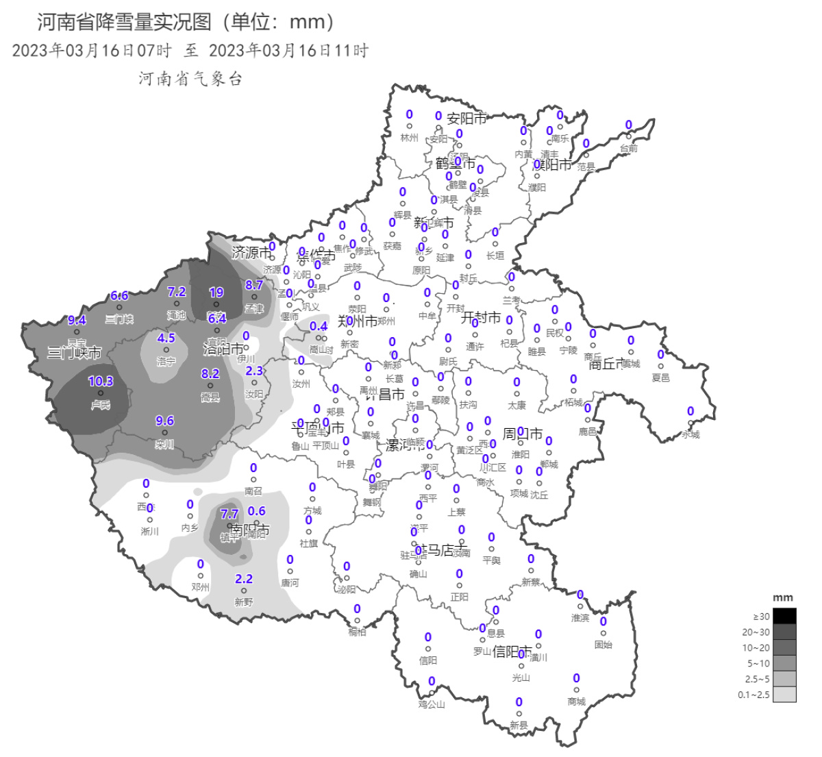 河南省气象台监测显示,3月16日7-11时,三门峡、洛阳、焦作、南阳等地部分县市出现中雨雪,局地暴雪。地市平均降水量洛阳9.8毫米、三门峡8.4毫米、南阳6.7毫米,降水量位列前三的分别为:新安19.0毫米、孟津14.3毫米、偃师12.9毫米。降雪量位列前三的分别为:新安19毫米、卢氏10.3毫米、栾川9.6毫米。目前,郑州西部和北部已出现小雨转小到中雪,最大降水量巩义8.5毫米。