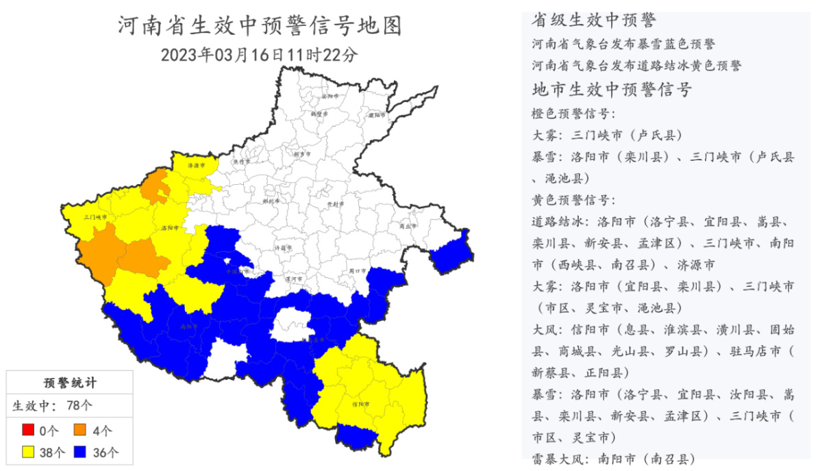 针对此次降水、降温等天气过程,3月14和15日,河南省气象局连续发布《天气报告》,16日发布道路结冰黄色和暴雪蓝色预警。