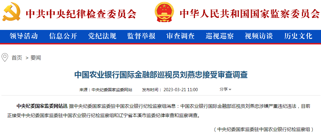 中央纪委国家监委网站讯 据中央纪委国家监委驻中国农业银行纪检监察组消息:中国农业银行国际金融部巡视员刘燕忠涉嫌严重违纪违法,目前正接受中央纪委国家监委驻中国农业银行纪检监察组和辽宁省本溪市监委纪律审查和监察调查。