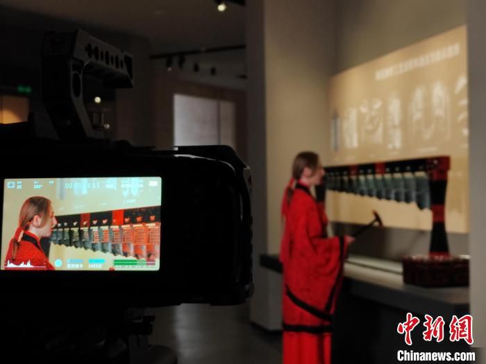 中新网太原3月23日电(高雨晴 胡健)“说起中国的古代乐器,你最熟悉的有哪些呢?今天我要带你来看看古代的乐器之王——编钟……”23日,山西青铜博物馆内,金发碧眼的摩尔多瓦外教伊莉娜,身着一袭红色曲裾汉服,一边敲打编钟仿制品,一边用一口流利的中文,在镜头前绘声绘色地介绍中国青铜文化。