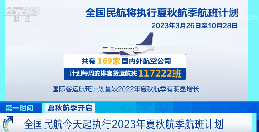 央视网消息:记者从民航局了解到,今天(3月26日)起至10月28日,全国民航将执行2023年夏秋航季航班计划。今年夏秋航季,共有169家国内外航空公司计划每周安排客货运航班117222班,国际客运航班计划量较2022年夏秋航季有明显增长。各地航空公司和机场也积极准备运力,迎接新航季的开启。