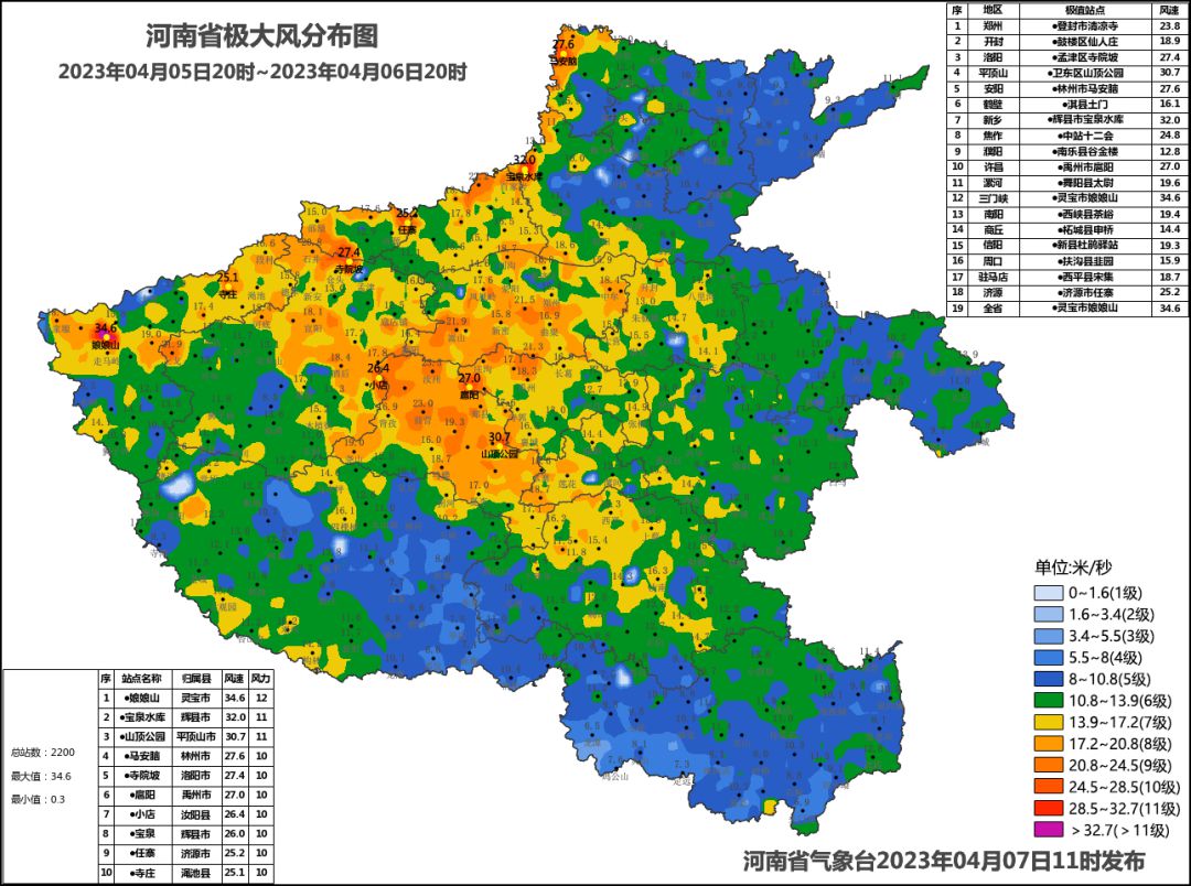 三门峡、新乡、平顶山、安阳、洛阳、许昌、济源、焦作、郑州、漯河、南阳、信阳、开封、驻马店等地66个县(市、区)共260站,出现阵风大于等于8级的西北大风。