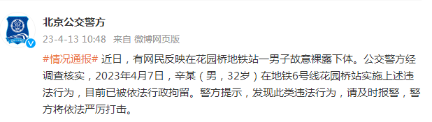 北京警方:花园桥地铁站一男子故意裸露下体已被行拘