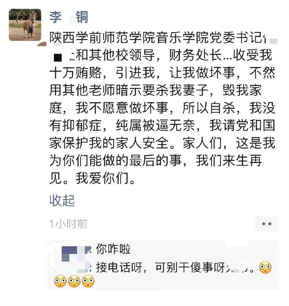 4月13日,李某铜的学生小杰(化名)告诉封面新闻记者,4月11日上午十点左右,他在自习课时看到李老师发的朋友圈。“陕西学前师范学院音乐学院的数名领导,收受我十万贿赂引进我,让我做坏事。我不愿意做坏事,所以自杀,我没有抑郁症,纯属被逼无奈……”学生们当即报警,警方表示已经有人在处理了。