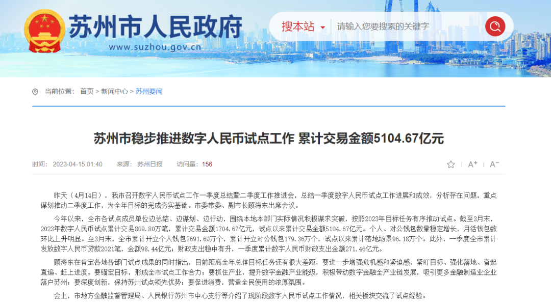 日前,苏州召开数字人民币试点工作一季度总结暨二季度工作推进会,截至3月末,2023年数字人民币试点累计交易809.80万笔,累计交易金额1704.67亿元,试点以来累计交易金额5104.67亿元。