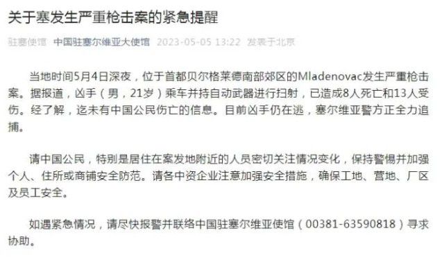 5月3日至4日之间,塞尔维亚发生两起枪击案,共造成17人死亡、20多人受伤。自5月5日至7日,塞尔维亚进入为期3天的全国哀悼期。中国驻塞尔维亚大使馆5日发布紧急提醒。