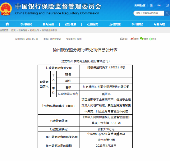 江苏扬州农村商业银行被开出120万元罚单,因其对江苏扬州农村商业银行股份有限公司信贷资金违规流入房地产领域、票据业务贸易背景不真实负管理责任。相关责任人许全被警告,罚款5万元;杨磊被警告,罚款7万元;任杰被警告,罚款7万元。